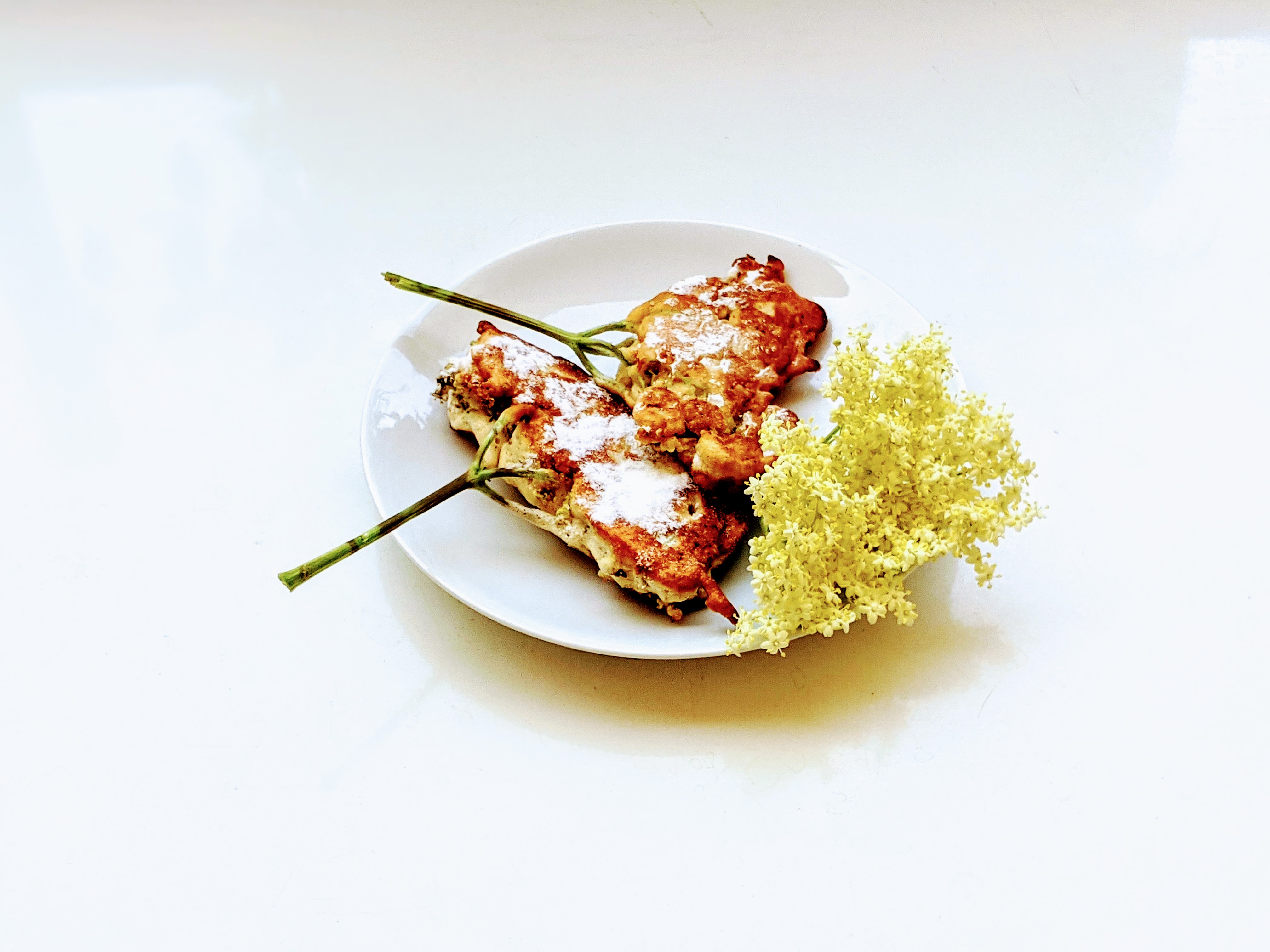 Für dieses Rezept müssen die Holunderblüten wirklich frisch sein und kräftig duften, nur so geben sie ihr Aroma an den Teig ab. Auch auf ein Waschen sollte man bestenfalls verzichten; schon beim Sammeln der Holunderblüten deshalb darauf achten, dass sie frisch geöffnet und sauber sind.