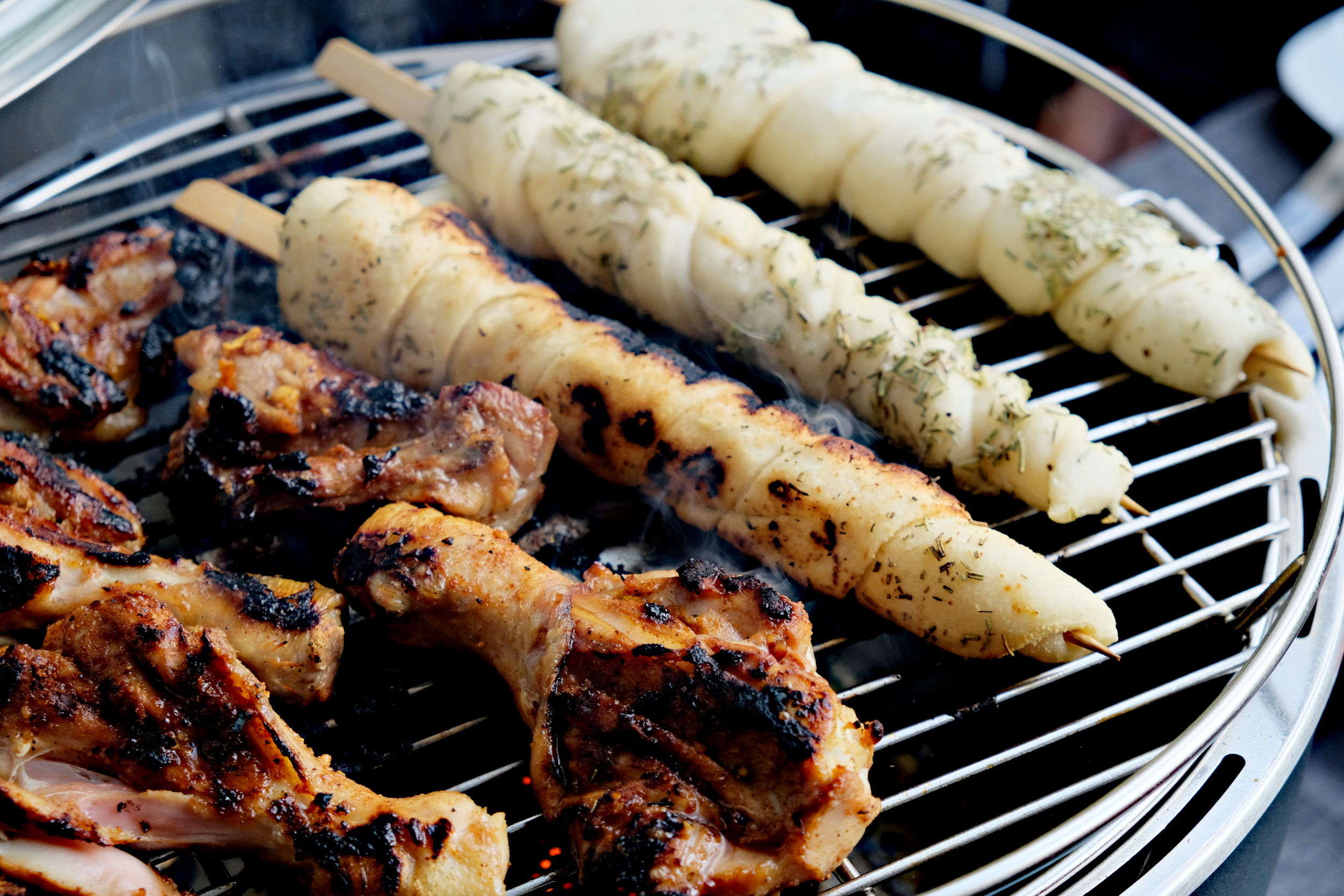 Die fertigen Spieße können direkt auf dem Holzkohlegrill gegrillt werden. Der Grill sollte nicht zu heiß sein, sonst verbrennen die Brote und sind innen noch nicht durch. Ggf. nochmal mit etwas Öl einsprühen, dann werden die Brote nicht so schnell schwarz.