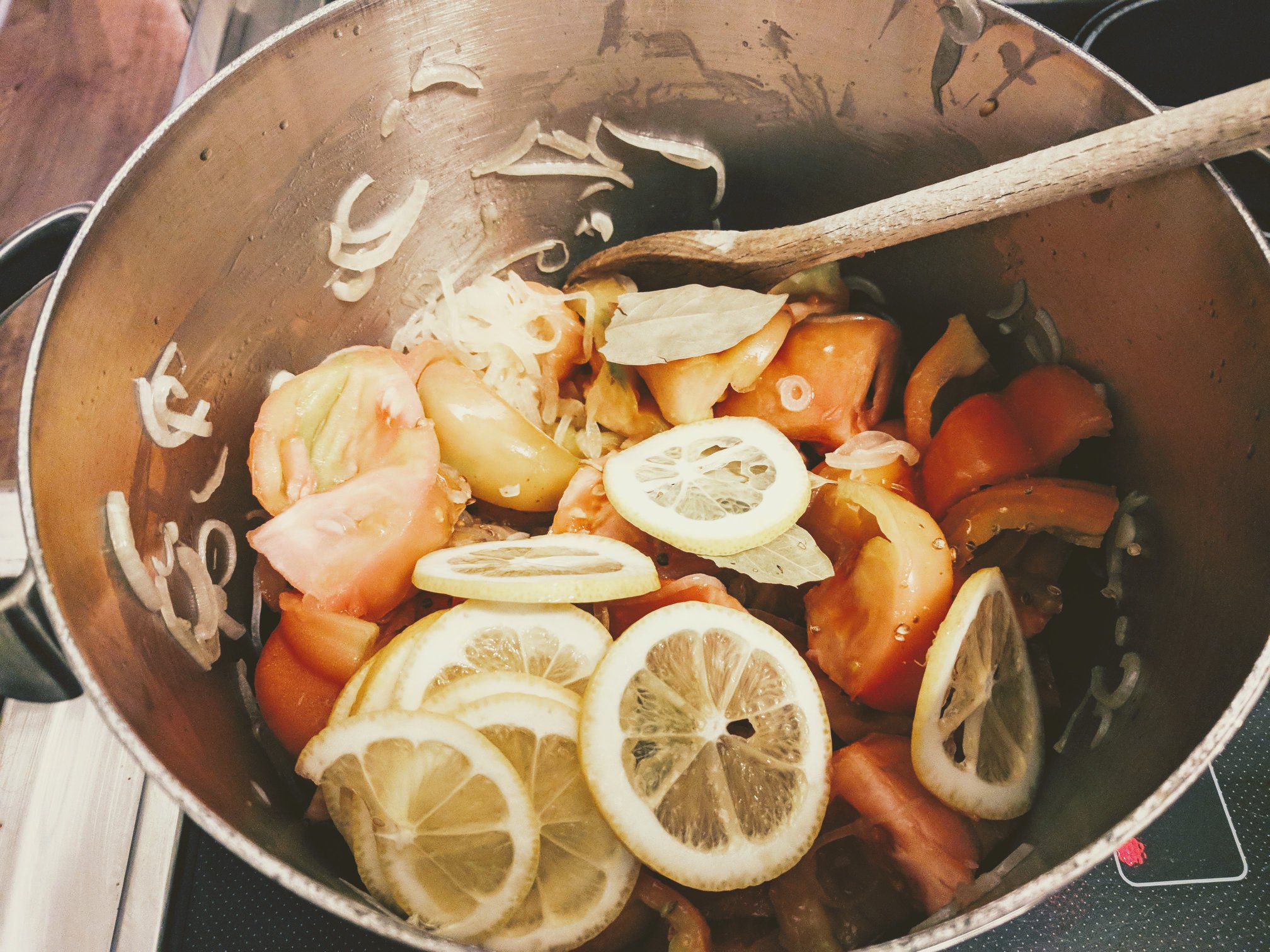 Olivenöl erhitzen, Zweibeln glasig anschwitzen. Tomaten, Sherryessig, Koriander, Zitrone, Lorbeer, Zucker und Salz hinzufügen; leicht pfeffern.