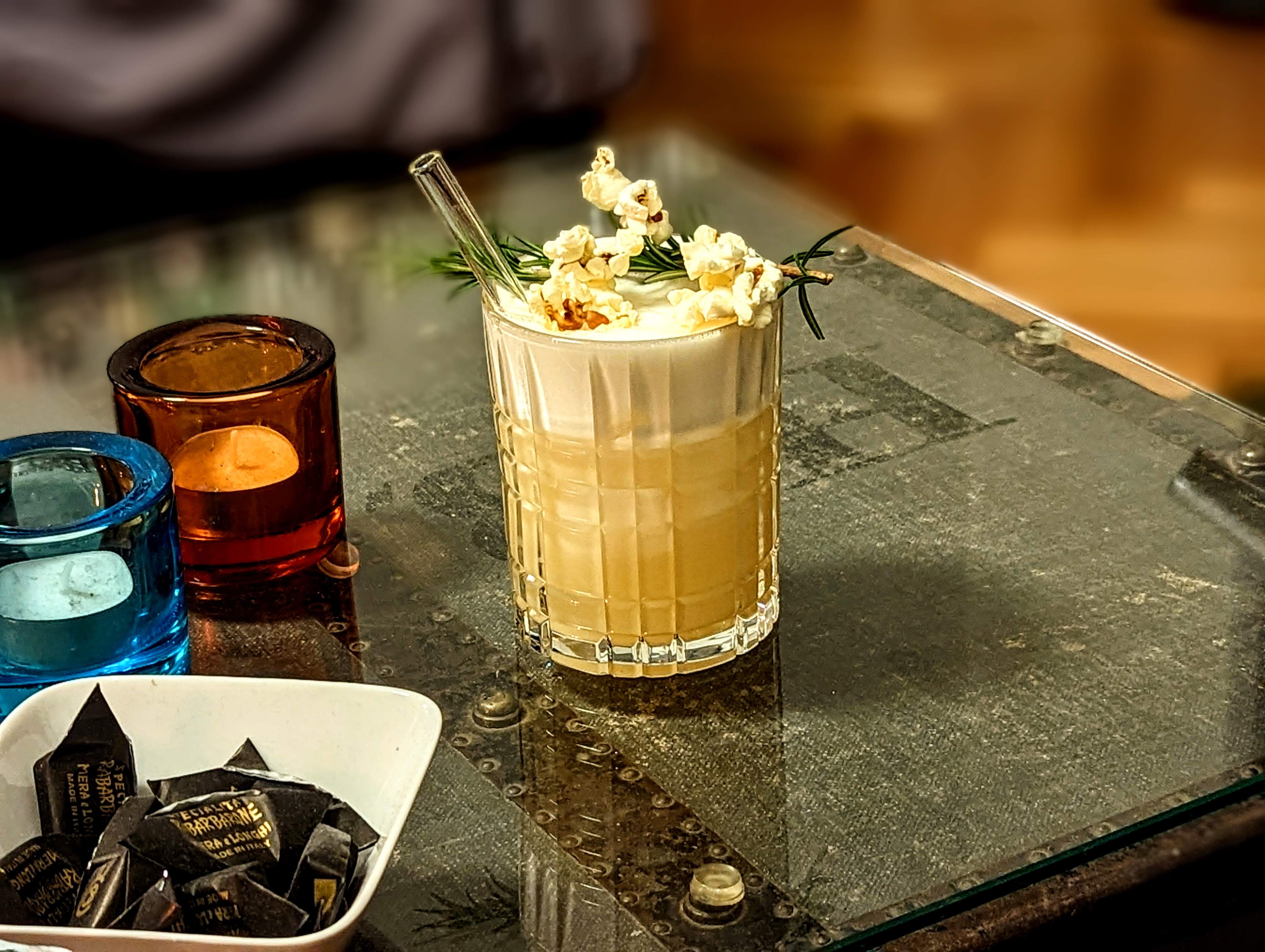 Mit Gesalzenem Popcorn und einem Rosmarinzweig auf dem Schaum servieren.