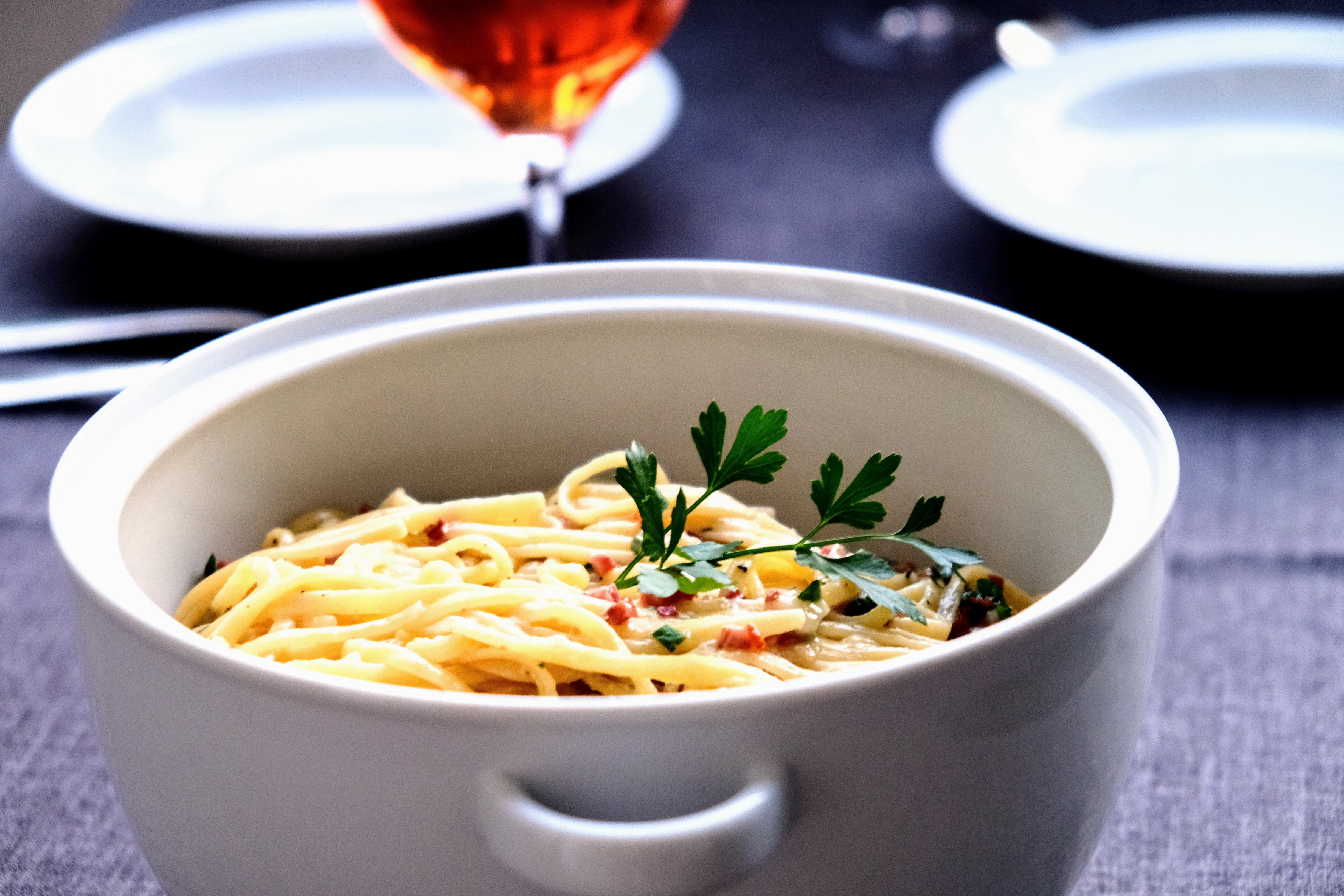 - Der Speck ist neben Käse die Zutat, die den Geschmack prägt. Deshalb sollte man sich genau überlegen, ob man einen kräftigen, guten Räucherspeck (meine erste Wahl, auch wenn es nicht ganz traditionell ist), einen italienischen Guanciale oder Pancetta (oft deutlich milder) oder etwas anderes benutzt. Erlaubt ist was gefällt.