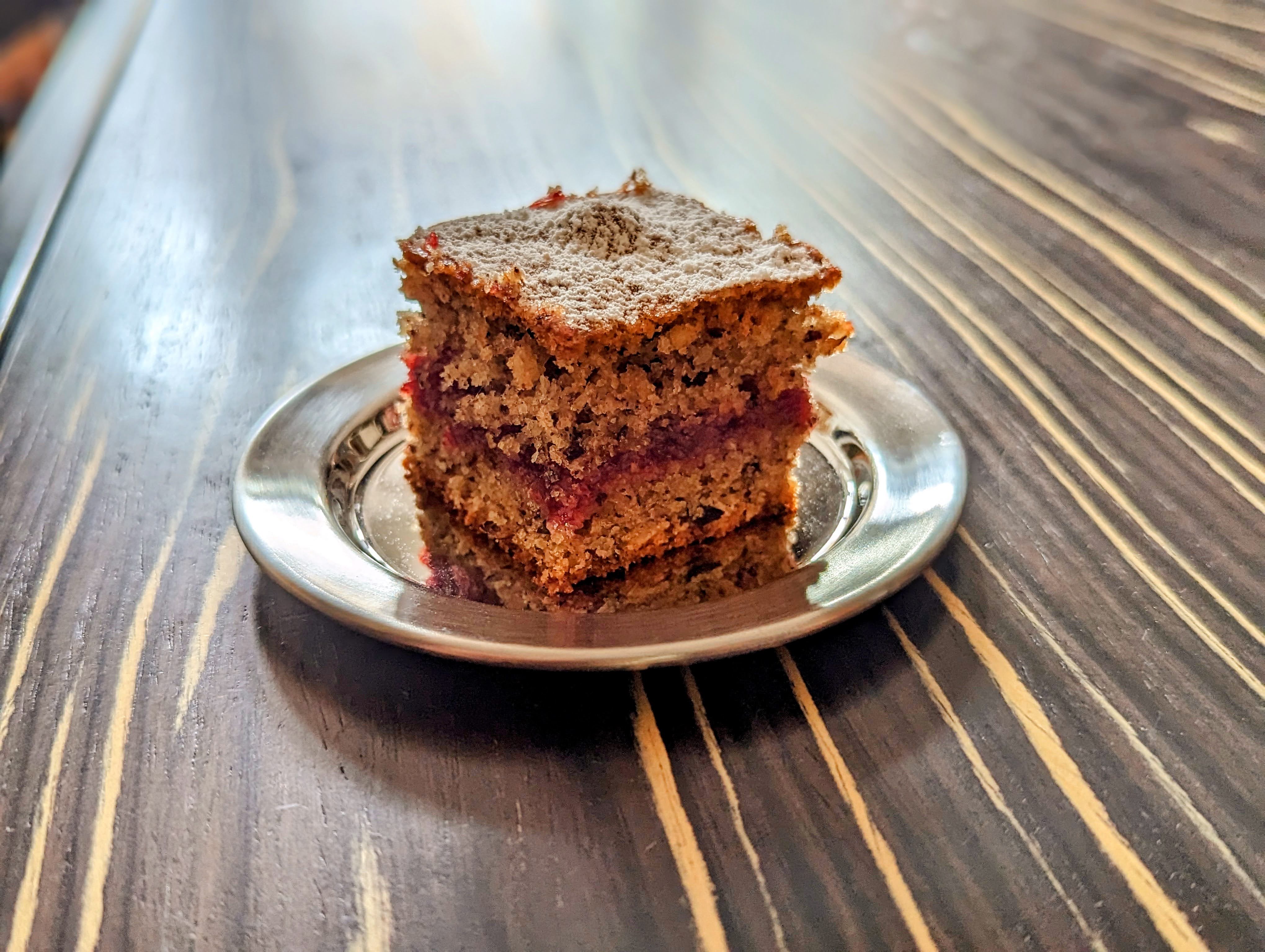 Abgekühlten Kuchen horizontal halbieren und mit Preiselbeermarmelade füllen. Mit Puderzucker dekorieren.